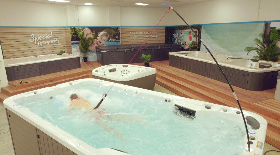The Fisher Dual™ is an affordable dual-zone swim spa that combines a hydrotherapy spa and a spacious swim area. Enjoy the benefits of both without the high price, featuring custom jet settings, a luxurious lounger, Fisher’s powerful hydromassage jets, swim-pole receiver, and easy step-in access for the complete spa experience.